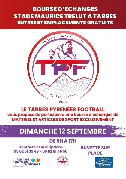 Des crampons trop petits, un maillot de Barcelone floqué Messi que vous ne voulez plus voir dans votre garde robe, vous cherchez un vélo, un appareil de musculation ou autres…le Tarbes Pyrénées Football vous attend le dimanche 12 septembre au stade Maurice Trelut pour la première bourse d’échange de matériel et équipement de sport.