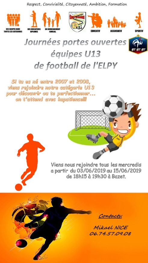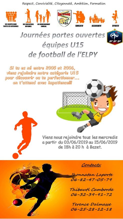 A LA UNEANNONCEELAN PYRENEEN BAZET BORDERES LAGARDE Annonce – Portes ouvertes U13 et U15 à l’ELPY 3 juin 2019 puk L’Elan Pyrénéen organise des journées portes ouvertes pour les catégorie U13 et U15.