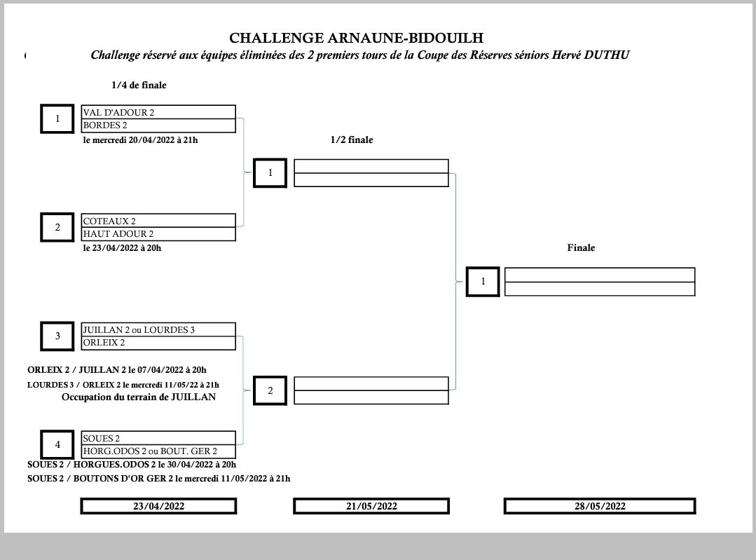 Le District des Hautes-Pyrénées a procédé au tirage au sort des quarts de finale du challenge Arnaune Bidouilh, ainsi que le tableau final.