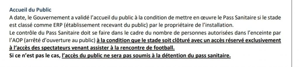 Si on comprend (…), le pass sanitaire est applicable dans les complexes de type ERP clôturés. Dans le cas contraire, le pass ne s’applique pas pour les spectateurs. Pour les joueurs et officiels, le pass sanitaire est obligatoire en toute circonstance.