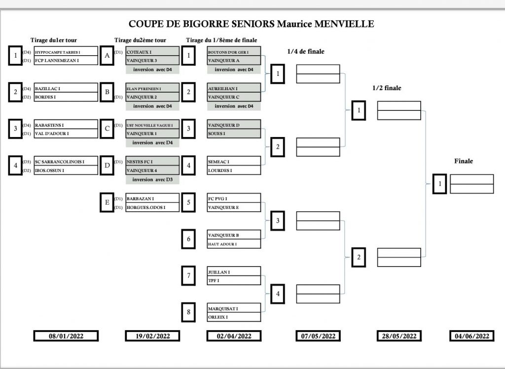 Toutefois, on se rejouit de retrouver la compétition phare de notre football departemental! Le tirage au sort de la coupe de Bigorre a même eu lieu et l’on connait le tableau jusqu’à la finale. Le premier tour de déroulera le weekend du 8 et 9 janvier, impliquant deux équipes de départemental 1.