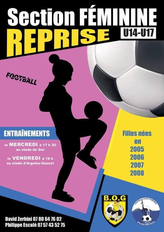 Le mercredi à 17h30 au stade de Ger et le vendredi à 18h au stade d’Argeles Gazost, les filles nées en 2005, 2006, 2007 et 2008 peuvent venir d’essayer au football.