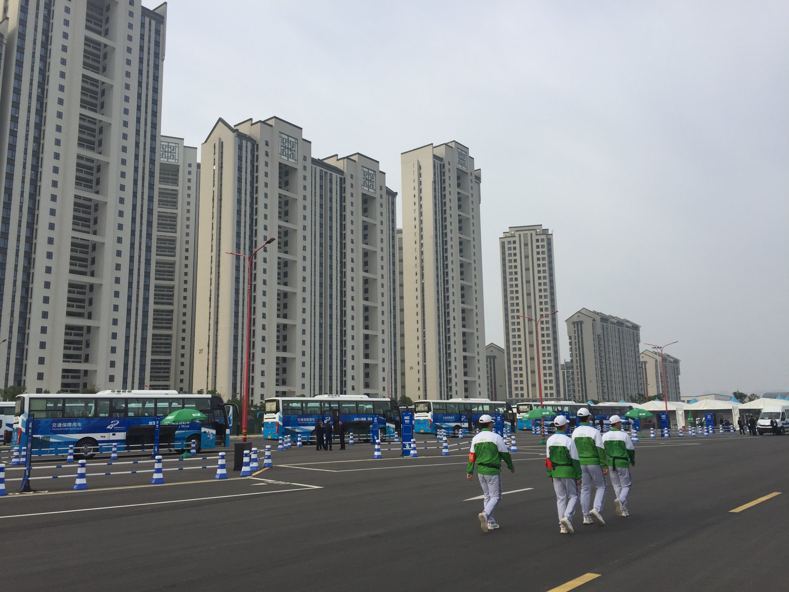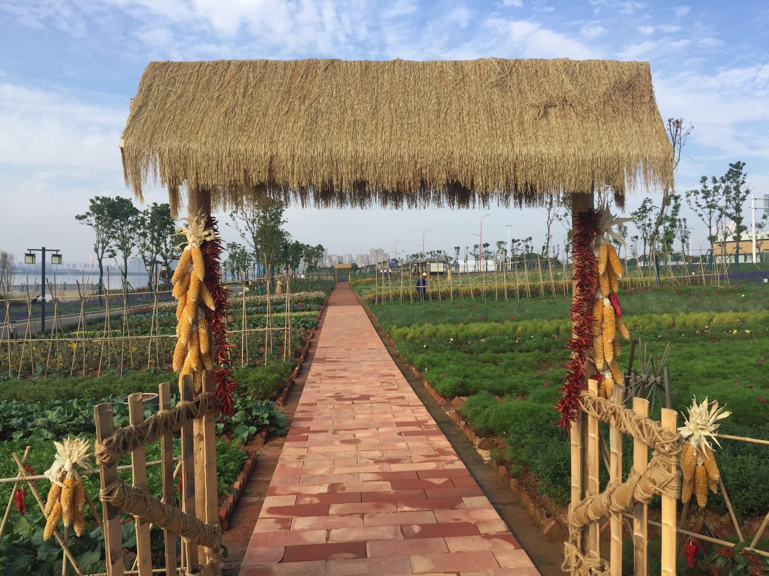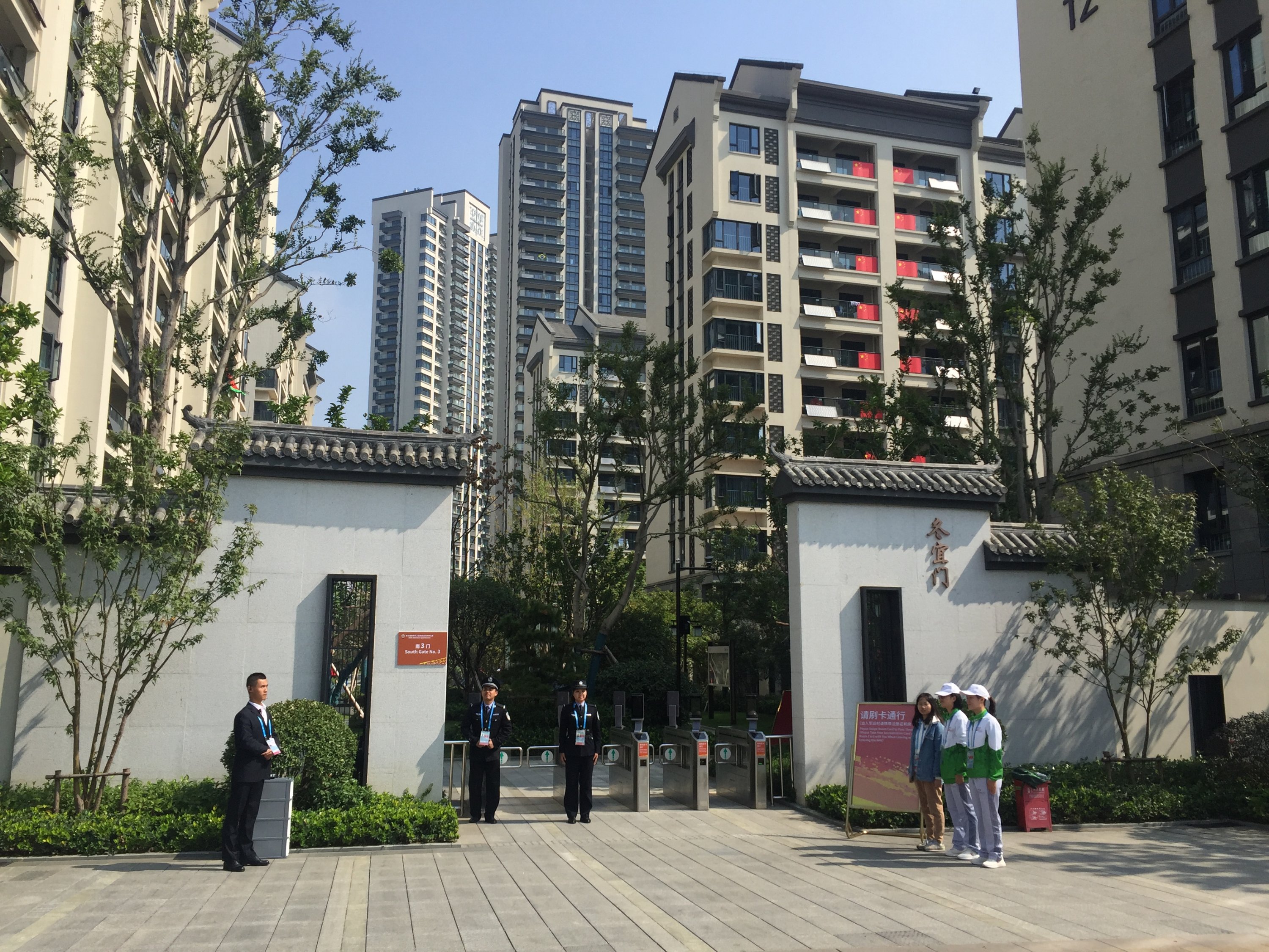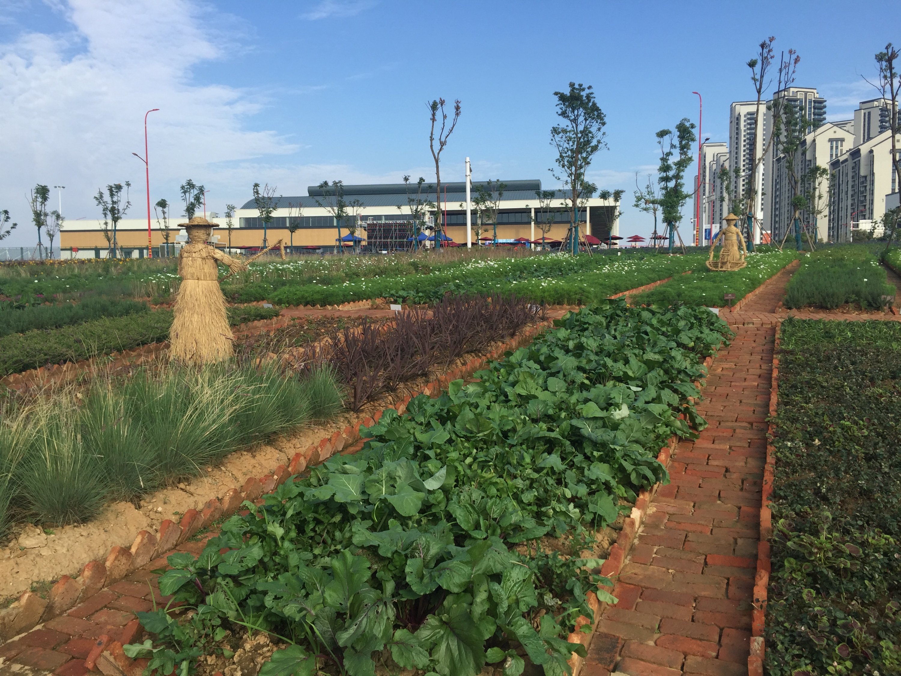 La délégation Française arrive au village. Bien entendu, la sécurité était omniprésenteC’est une véritable ville qui a été construite en quelques moisUne ville avec ses espaces verts, ses rues, ses monuments,…et son architecture Chinoise.Un jardin traditionnel Chinois a été érigé et cultivé en bordure du village…donnant de la couleur au paysage.