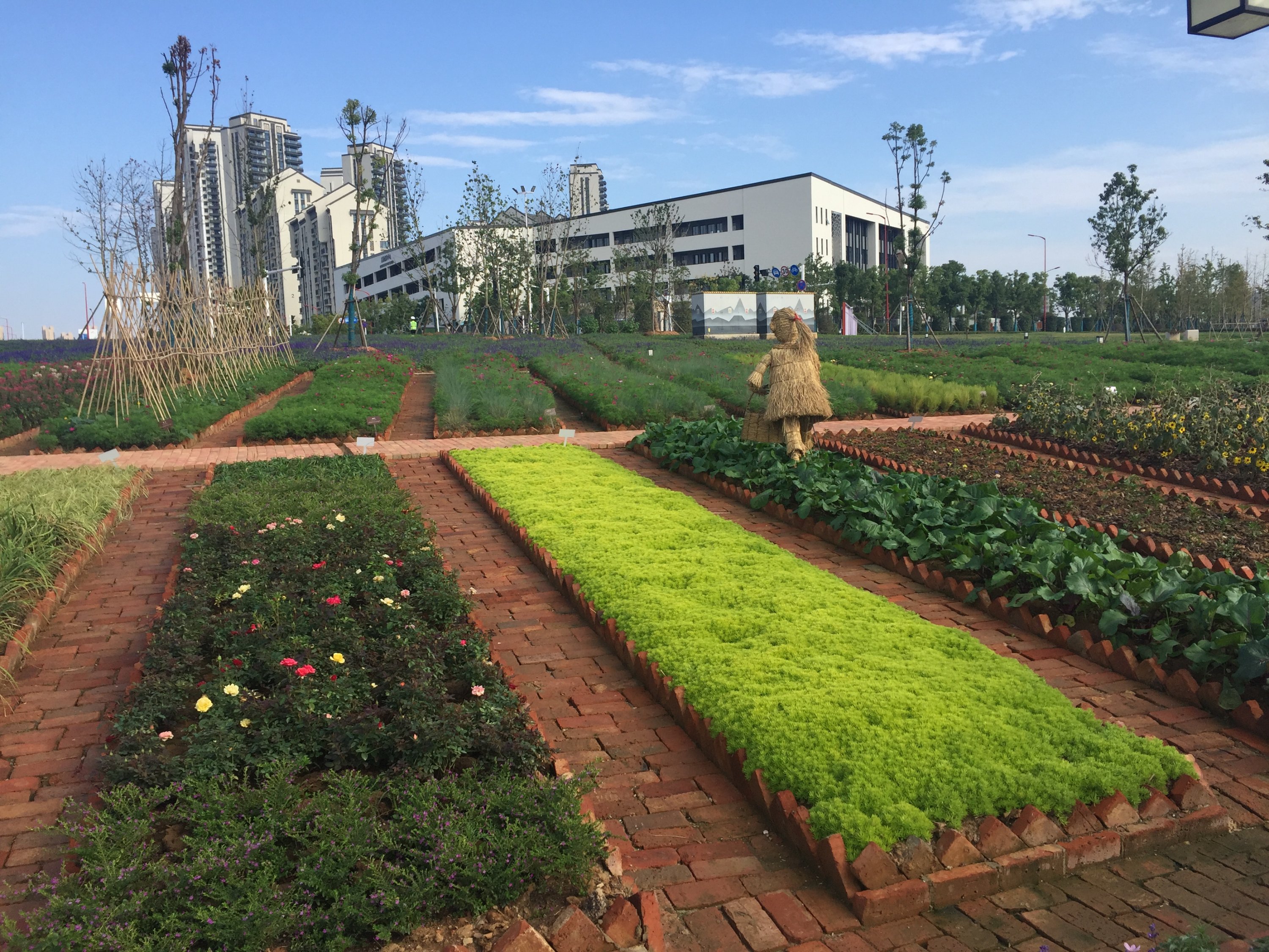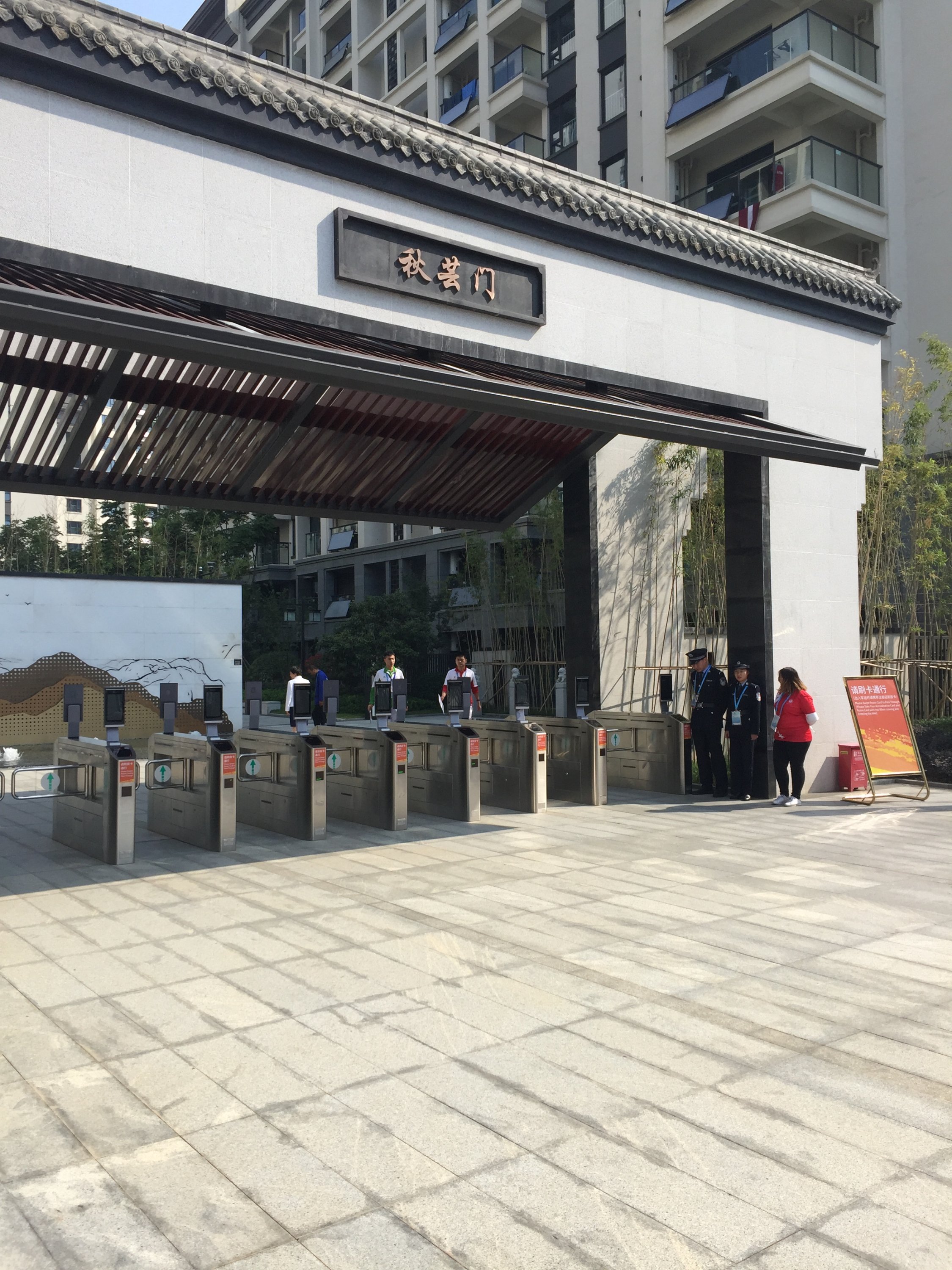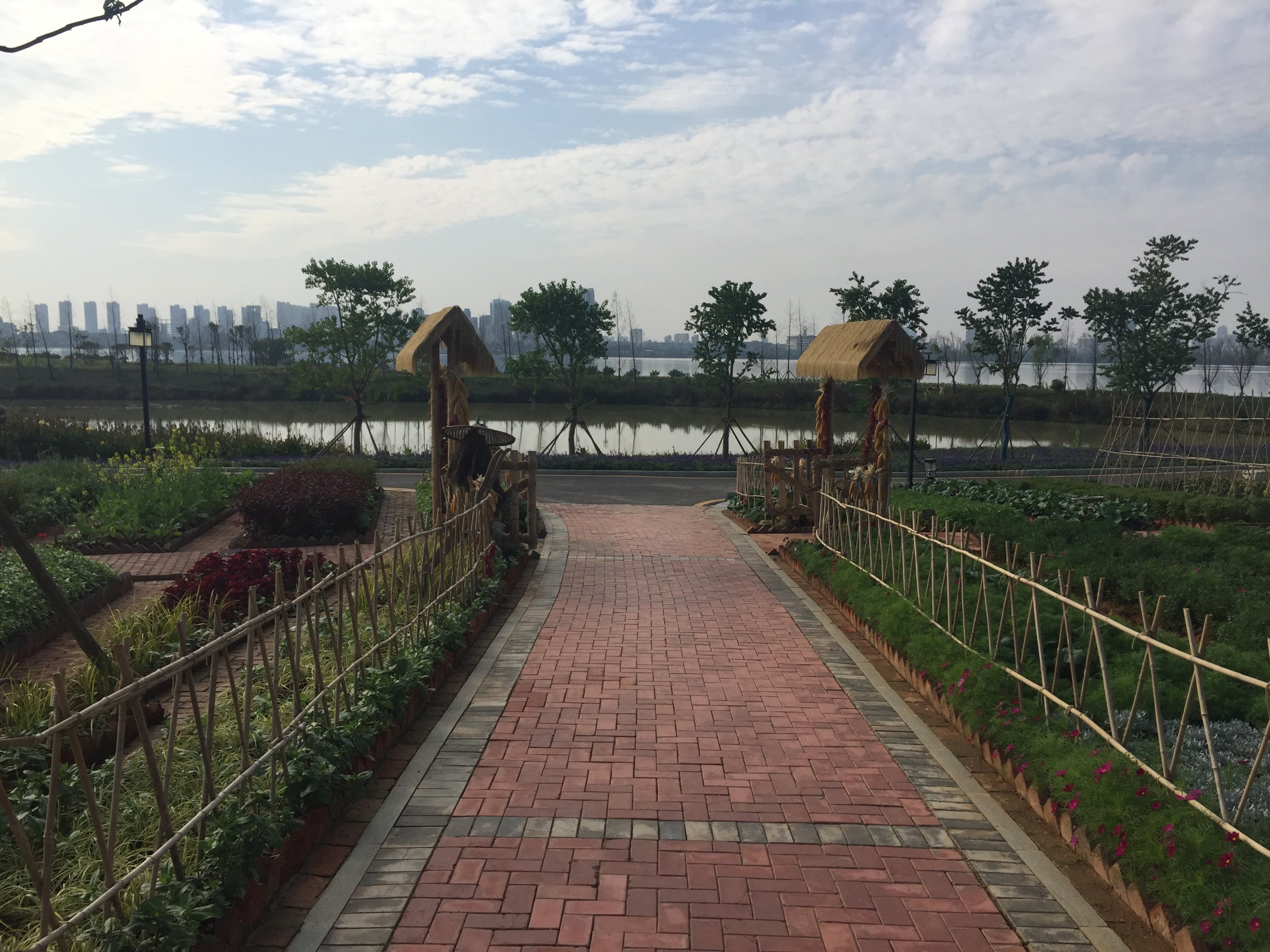 La délégation Française arrive au village. Bien entendu, la sécurité était omniprésenteC’est une véritable ville qui a été construite en quelques moisUne ville avec ses espaces verts, ses rues, ses monuments,…et son architecture Chinoise.Un jardin traditionnel Chinois a été érigé et cultivé en bordure du village…donnant de la couleur au paysage.