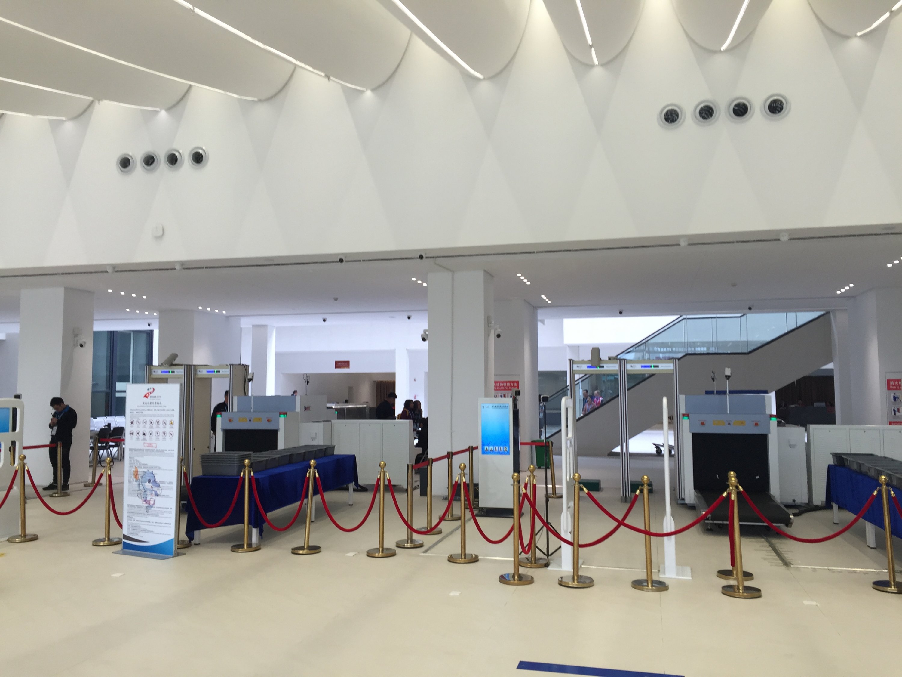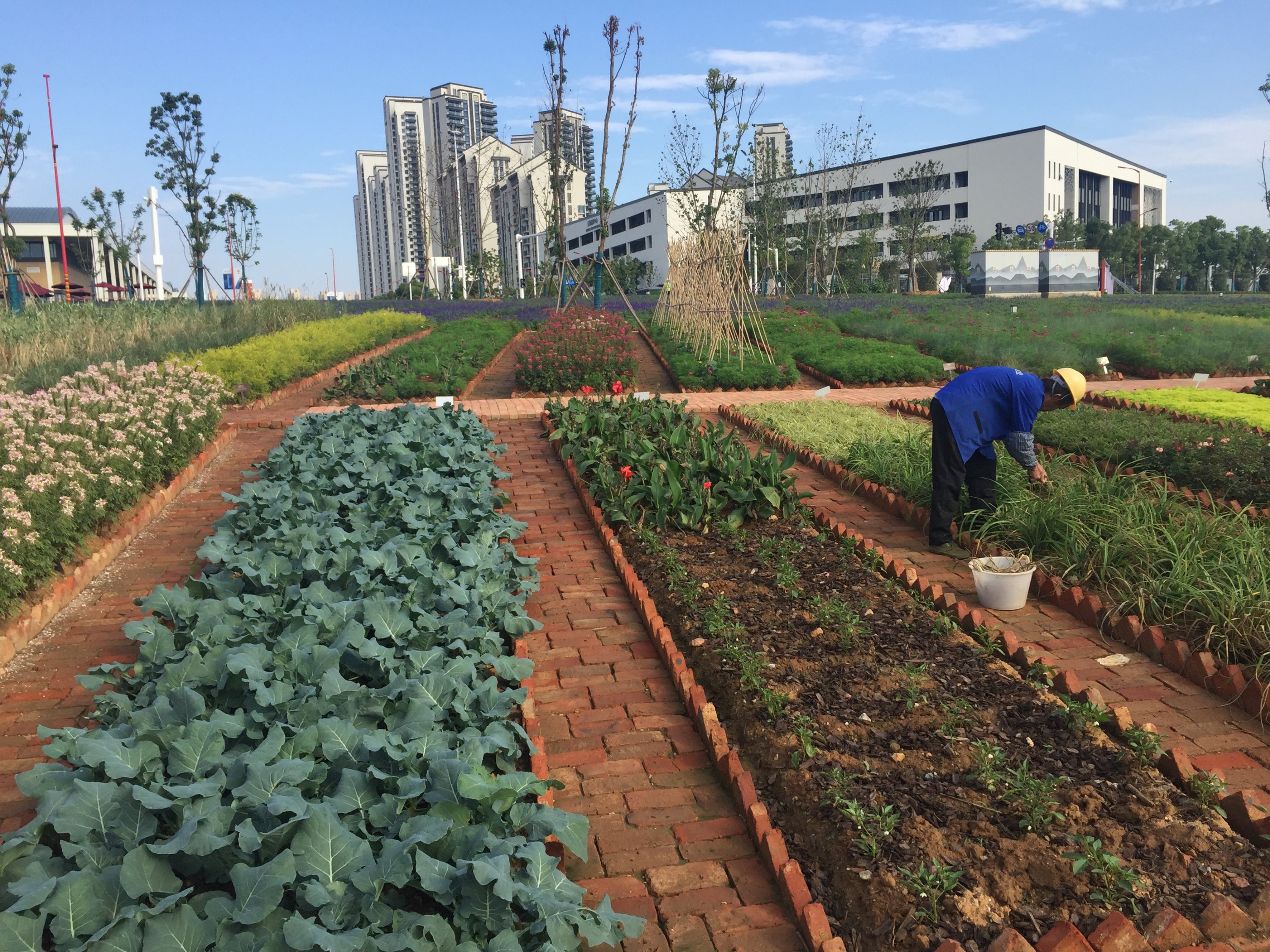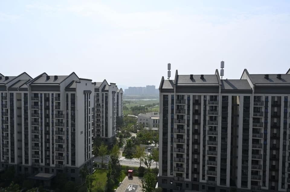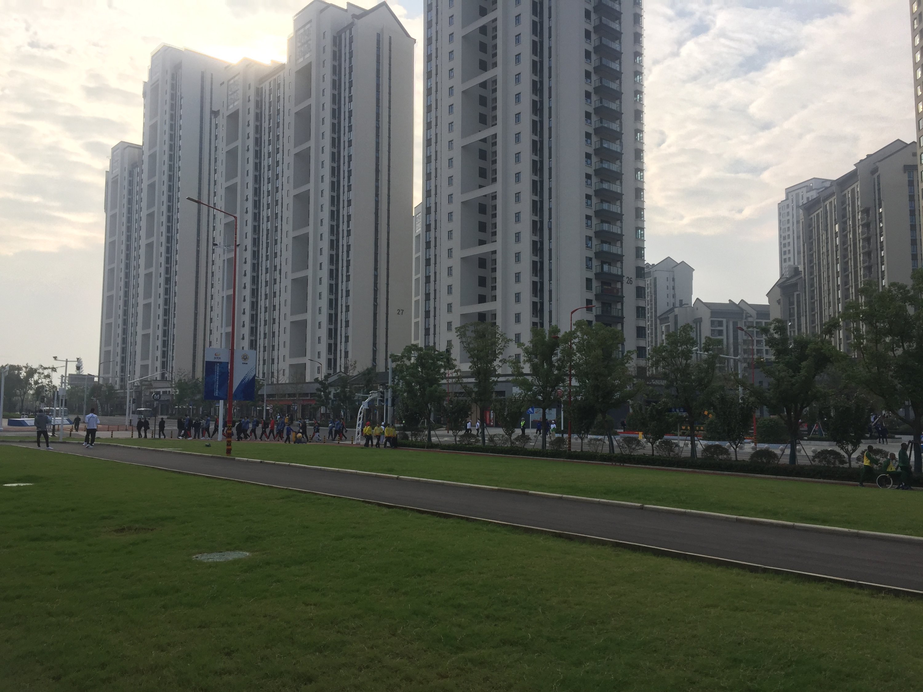 La délégation Française arrive au village. Bien entendu, la sécurité était omniprésenteC’est une véritable ville qui a été construite en quelques moisUne ville avec ses espaces verts, ses rues, ses monuments,…et son architecture Chinoise.Un jardin traditionnel Chinois a été érigé et cultivé en bordure du village…donnant de la couleur au paysage.