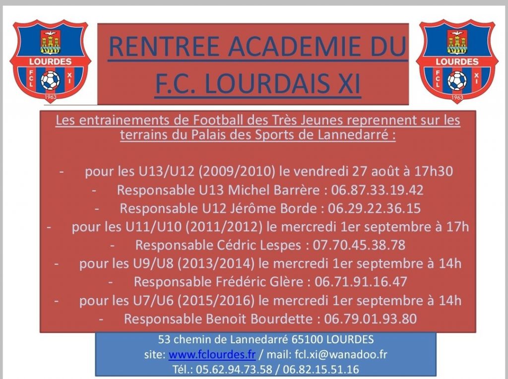 Après les séniors, c’est au tour des jeunes de faire leur retour sur les terrains. Pour l’académie du FC Lourdes, ce sont les U12/U13, encadré par le mythique duo Michel Barrere/Jérôme Borde, dès ce vendredi 27 Août. Les autres catégories suivront le mercredi 1er septembre.
