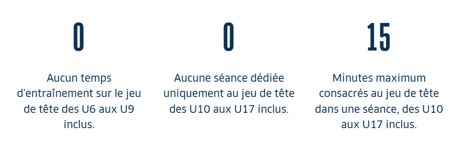 En U14/U15 et U16/U17, la pratique du jeu de tête est autorisée en match mais pas à l’entraînement.