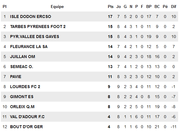 Enfin, décrochés avec quatre points de retard sur le dixième, les deux relégables actuels sont Bigourdans : Val d’Adour et Ger. Destin lié pour ces deux équipes qui s’étaient neutralisées en septembre (2-2) et qui comptent chacune une victoire au compteur, obtenues face à Orleix. Les Boutons d’Or jouent déjà une partie de leur avenir dés le 6 janvier avec un déplacement à Gimont (9ème) avant un déplacement crucial à Maubourguet, où malheur au vaincu. Un FCVA qui est reparti sur de nouvelles dispositions avec un changement d’entraîneur. La route est très longue vers le maintien mais l’on peut déjà, s’en trop se tromper, se dire qu’il y aura au minimum un Bigourdan dans la nasse en fin de saison, en espérant pas deux.