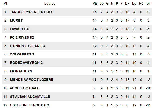 Même si la nouvelle direction du club Tarbais s’en cachait, l’objectif véritable d’être dans le haut de tableau est tenue par la bande des frères Fachan. Après un recrutement de haute facture, les Tarbais ont tenu leur rang et se positionnent clairement en favoris pour obtenir la place de barragiste à l’accession en National 3. Premier de leur poule C avec un point d’avance sur Muret mais surtout deux matchs en retard, ils ne peuvent toutefois rester sur leurs acquis avec un début 2024 qui devrait révéler le vrai potentiel de cette équipe qui se déplacera à Rodez II (6 janvier) avant de recevoir son dauphin actuel Lavaur (13 janvier), le troisième FC 2 Rives (20 janvier) et de terminer cette reprise en fanfare par un déplacement à L’Union, le quatrième (4 Février).