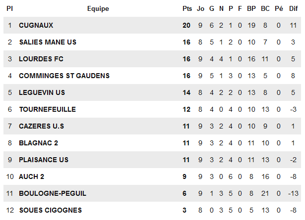 Destin contraire pour nos deux représentants dans cette poule D mais ce n’est qu’une confirmation de ce que les bookmakers Bigourdans pensaient au lancement de la saison. Relégués de R1, les Lourdais sont sans surprise dans le haut du panier en compagnie des autres favoris que sont Cugnaux, Salies et St Gaudens. Un FCL XI qui se retrouve troisième à quatre points du leader avec des regrets puisque s’il ne perd pas ou peu (1 seule défaite), il n’arrive pas à concrétiser avec quatre résultats nuls obtenus qui avec un peu plus de réussite auraient permis d’être en tête à la trêve. Cependant, les joueurs de Bourdette savent que c’est le secteur défensif qu’il faudra améliorer pour être au rendez-vous avec seulement la septième défense actuelle du championnat alors que la machine à marquer des buts fonctionnent un peu mieux (16 buts, deuxième du championnat). Des Lourdais qui peuvent pester d’avoir laissé des points face aux équipes de bas de tableau (Soues, Boulogne) alors que se profile une reprise 2024 du tonnerre avec des déplacements à Salies (13 janvier) et Cugnaux (3 février) entrecoupés de deux derbies face à Auch II (20 janvier) et Soues (24 février) à domicile.