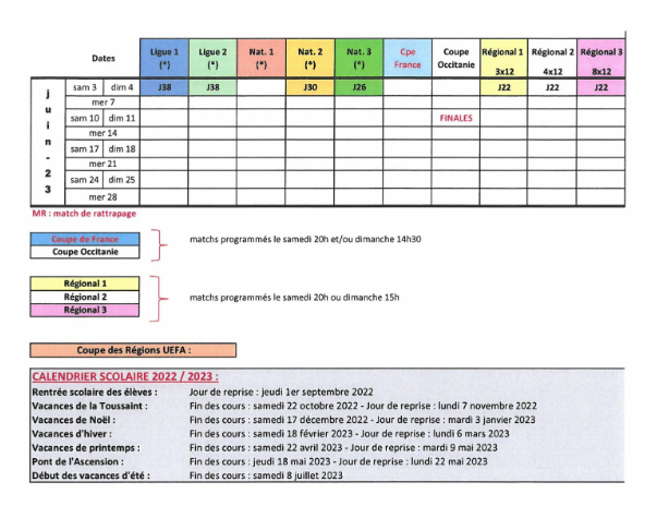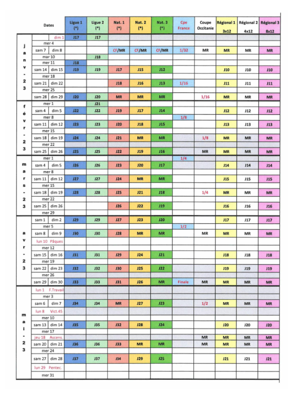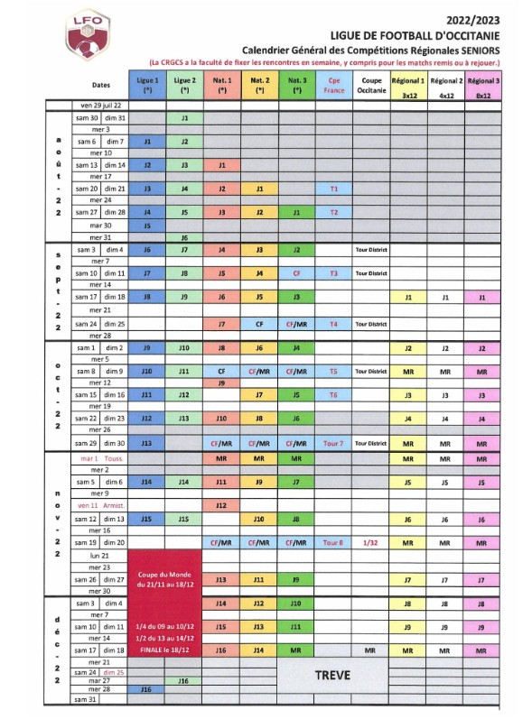 La ligue Occitanie a communiqué le planning de la saison 2022/2023 concernant les compétitions de niveau régional sénior. Pas de trêve pendant la coupe du Monde qui se jouera au Qatar du 21 novembre au 18 décembre. Voici les principales dates à retenir :