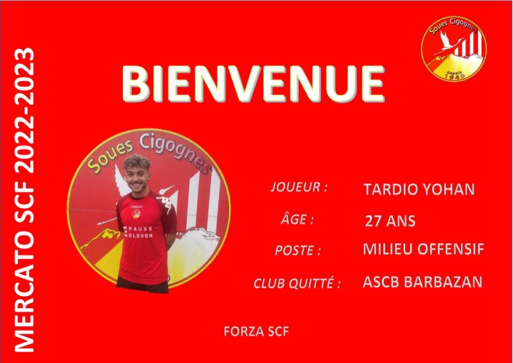 Les Cigognards continuent leurs amplettes lors de ce mercato estival 2022. Le club a annoncé une troisième recrue. Dylan Heugas va voir un ancien coéquipier le rejoindre en provenance du club de Barbazan puisque le milieu de terrain offensif de 27 ans, Yohan Tardio, rejoint Soues.