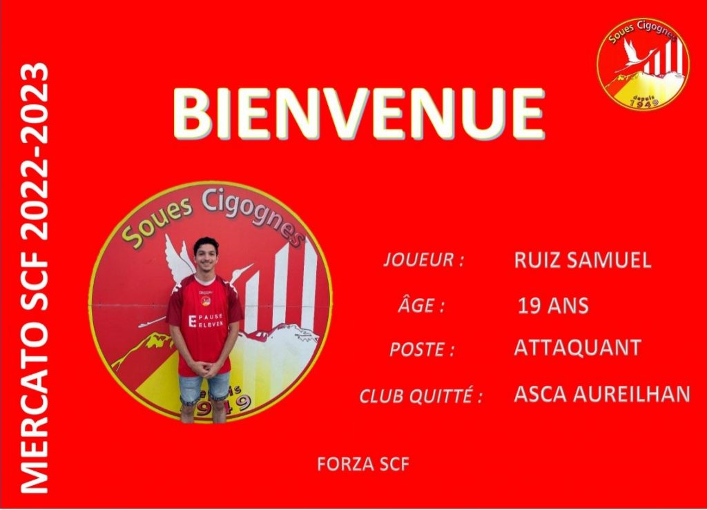 Samuel Ruiz qui évoluait sur le front de l’attaque Aureilhanaise en Régional 3 cette saison rejoint les Cigognards. Le joueur de 18 ans s’est formé au Tarbes Pyrénées Football. Il a déjà connu le club Souessois lors de la saison 2021/2021.