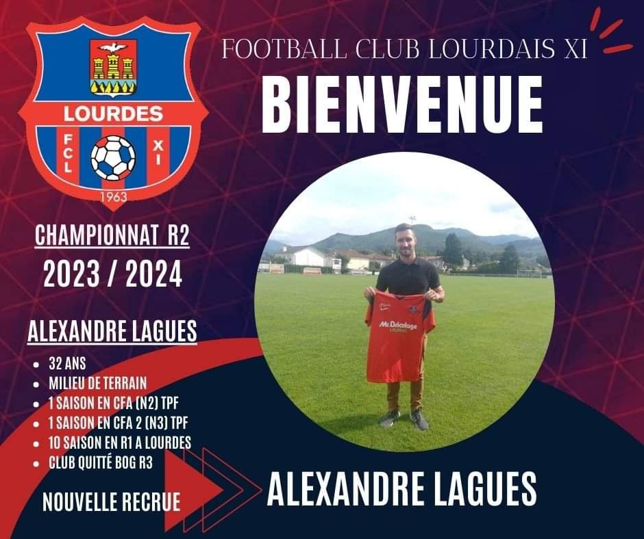 Le FC Lourdes XI enregistre un nouveau renfort avec le retour d’Alexandre Lagues. Le milieu de terrain de 32 ans, passé par Tarbes où il a évolué en CFA et CFA2, retrouve un club où il a déjà passé dix saisons en R1. Il vient en provenance de Ger.