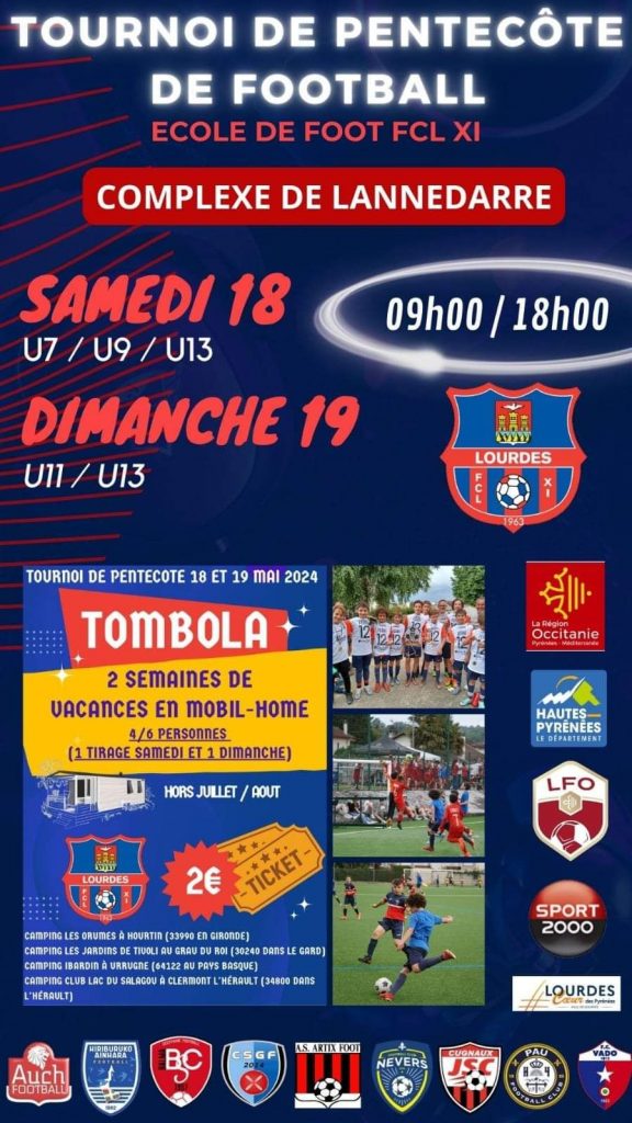 Un tournoi international U13 avec la venue de Vado (Italie) et des équipes régionales comme Balma, Cugnaux, Auch, Hiribuku (64), Nevers (ville jumelé avec Lourdes), St Gaudens, Artix, Pau fc et dess équipes du département. Pour l’occasion, le football sera mise à l’honneur dans un tournoi festif et convivial avec également les catégories des plus jeunes U11, U9 et U7.