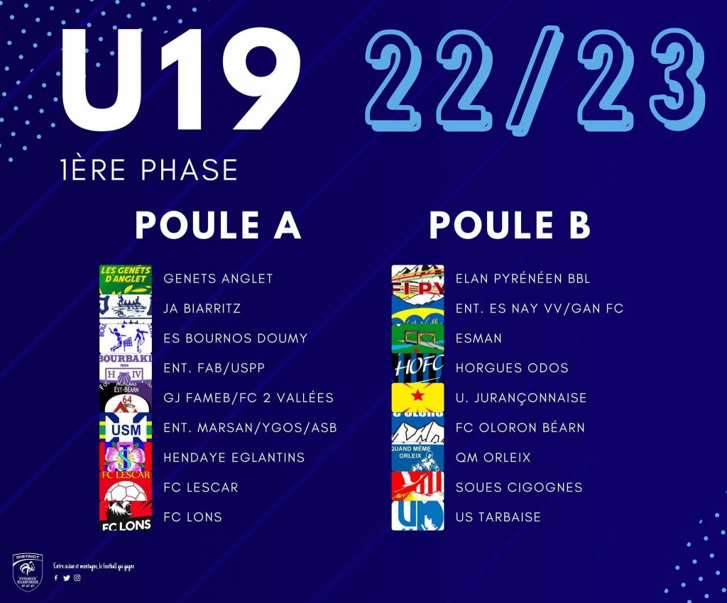 Comme la saison dernière, des équipes des Hautes-Pyrenees disputeront le championnat de la catégorie U19 dans les Pyrénées Atlantiques. Cinq équipes du 65 (Soues, ELPY, Horgues Odos, Nouvelle Vague et Orleix) participeront à cette première phase. Ils sont tous dans la pouleB en compagnie de Nay, ESMAN, Jurançon et Oloron.