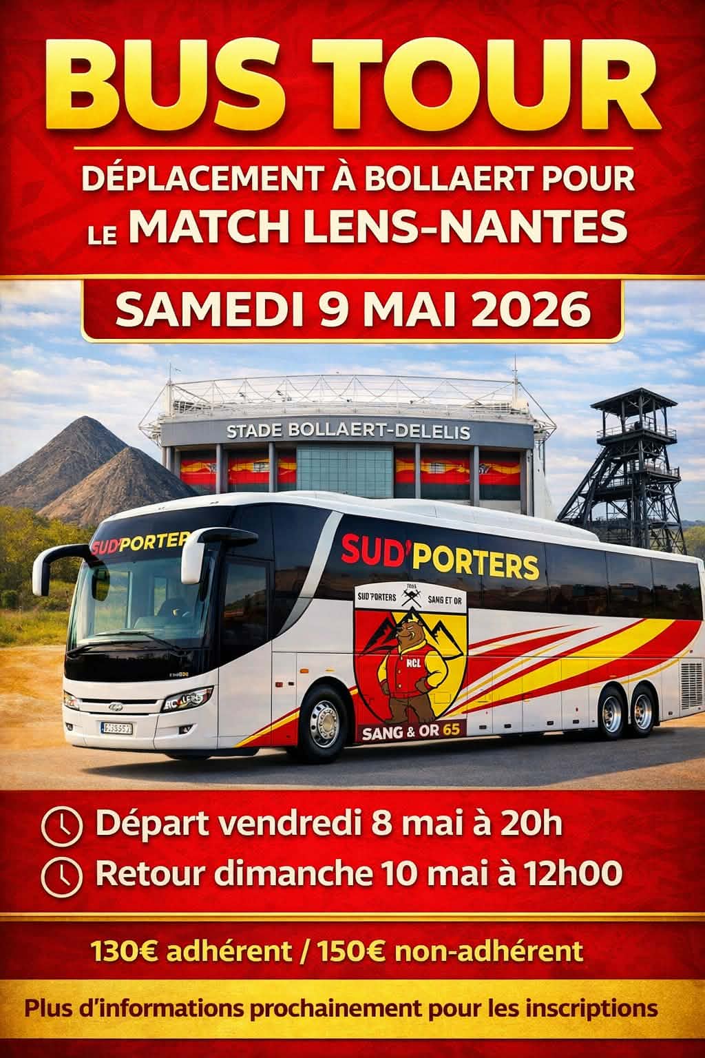 L’association Sud’Porters Sang et Or 65 lance officiellement les inscriptions pour son grand déplacement en bus au stade Bollaert-Delelis, à l’occasion du match RC Lens – FC Nantes, programmé durant le week-end du 8 mai 2026.